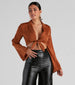 Let this satin top do the talking! Step out in this silky satin crop top featuring long bell sleeves. a collared v-neckline. and tie-front closure. Complete the look in sleek faux leather pants.