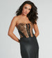 Keep it skin tight in this saucy snake print faux leather corset top for a cool-girl vibe out on the town! Made from a sleek faux leather fabric with a snake print. this strapless corset boasts a sweetheart neckline. flexible boning for a snatched look. and bungee strap lace-up trims that add sultriness to the cropped silhouette. Complete the look in sleek faux leather leggings and heels!