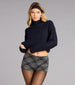 Classic knit. cropped just right. This mock neck cable sweater mixes timeless texture with a modern silhouette—perfect for pairing with high-rise denim. leggings. or a little pleated mini moment.