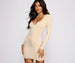 Rock a basic mini dress for that next coffee date with bae or layer up for a casual shopping spree. The dress features a notched V-neckline. long sleeves. and a mini length silhouette. The dress is composed of a ribbed knit fabric that offers a form hugging fit that offers a moderate stretch. Complete look with ankle booties.