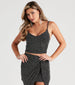 Step looking so chic in this glitter metallic knit crop top featuring a sleeveless V-neck. spaghetti straps. and a fitted hem. Complete the look with matching bottoms for your next girl's night!