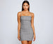 Oh-so-chic. this plaid mini dress is a staple you can take into the fall season! It features a trendy square neckline. spaghetti straps. and a short. curve-hugging silhouette. Style this knit dress with clear heels and a faux leather jacket.