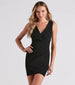 This chic crepe mini dress is a classic staple essential to your wardrobe. The short dress features a sleeveless V-neckline with a surplice design. tank shoulder straps. pleated detailing at the bodice and waist. a faux wrap-front skirt. and a mini-length asymmetric hem with a form-hugging fit. The crepe fabric offers a moderate stretch. Style with an oversized blazer and strappy mules.