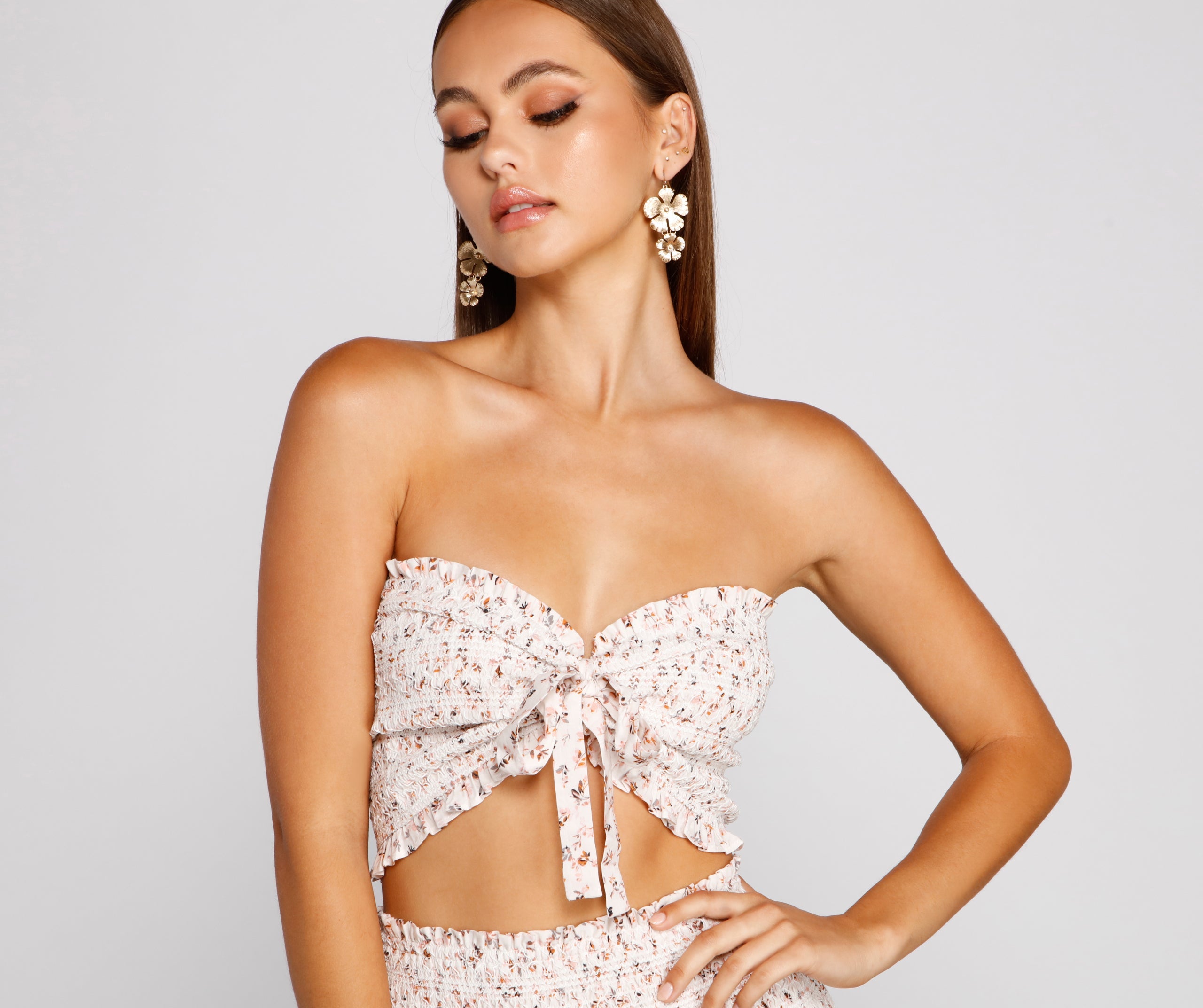 Get a darling and chic look with this ditsy floral tube top that is perf for summer! It features a strapless sweetheart neckline. a cute tie-front detail. a cropped. form-hugging fit. and a smocked design. Complete the outfit with the matching mini skirt for weekend brunches with the girls.