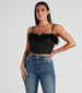 You'll look so fine and classy in this marabou trim corset perfect for a party! It features a sleeveless. sweetheart neckline. adjustable spaghetti straps. a marabou feather trim. a built-in padded bust with underwire support. and flexible boning inserts along the fitted crop hem with back hook-eye closures. Complete your dressy look in wide-leg pants.