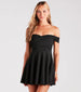 There's so much to love about this crepe skater dress perfect for twirling the night away! It features an off-the-shoulder surplice neckline. short-sleeve cuffs. and a flattering fit and flare short-length hem. The dress is crafted from a sleek crepe fabric with a stretchy knit lining. Complete the look in statement block heels for a school dance or birthday!