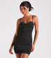 The obsession is real with this sultry-glam mini dress. The short dress features a sleeveless sweetheart neckline with sparkling rhinestone embellishments peeking through at the bust. adjustable spaghetti straps. ruching down the side seams. a mini-length hem. and a bodycon silhouette that will hug your curves. Style this short dress with platform heels for a night out with your girls.