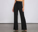 Keep it polished in high waist pants to dress up in! The pants feature a high-rise waist. a tie-waist detail. and a straight leg with a flared hem. Complete look with a rhinestone bustier.