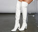 You'll be so seductive in this pair of thigh-high boots! They're made of faux patent leather with an almond toe. block heel. and a side zipper closure. Wear them with a bustier and mini skirt for your next night out.