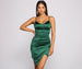 Stun in a mini dress that embraces curves in all the right places. The dress features a sleeveless V-neckline with padded cups. adjustable spaghetti straps. a ruched side seam. and a mini length silhouette with an asymmetrical hem. The dress is composed of a lined stretchy satin fabric that offers a curve-hugging fit. Complete look with a sleek clutch and a rhinestone choker.