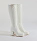 Showcase your stunning taste with faux patent leather under-the-knee boots that feature an almond toe with a platform. an inner zipper closure for a secure fit. and a sturdy block heel. Complete the outfit with a bodysuit and mini skirt.Â