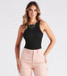 This casual ribbed sweater knit bodysuit showcases a sultry detail that will turn heads! It features a sleeveless crew neckline. tank shoulder straps. an open back with a strappy lace-up design. a thong bottom with a dual snap button closure. and a form-hugging fit. Pair with high-rise cargo pants and clear mules.
