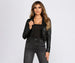 It's all in the zipper details! This moto jacket is a must for a chic and sleek vibe. Layer this jacket for a night out with the squad. The jacket features an asymmetrical zipper front. small zippered pockets. zipper details on the shoulder. a cropped. form-hugging fit. and is composed of faux leather fabric. Complete your look with high waist denim jeans and sleek hoops.Â