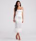 Forever timeless and classic. the Sofia formal satin dress embodies the 90s chic style perfect for date nights. dances. or cocktail soirees! She features a sleek and sleeveless square neck. adjustable spaghetti straps for a customizable fit. and a form-hugging silhouette with a back slit accent and feather trim midi hem. The formal dress is composed of a lustrious satin-lined fabric with a moderate stretch. Style with stiletto mules and a clutch to complete the look!