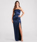This figure-skimming beauty is worthy of a grand debut at banquets. weddings. and dressy celebration parties! The Sofie formal dress features a foldover. strapless neckline. a lightly padded bust. a slim curve-hugging silhouette. and a sultry front slit along her floor-length hem. The formal dress is composed of lined satin fabric with a sheen effect and minimal stretch. Complete the look in statement mules and a clutch.