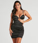 Some nights call for a sultry satin dress like this to party in! Make an entrance in this bodycon mini dress featuring a sleeveless. sweetheart neckline. built-in padded bust with underwire support and rhinestone trim. adjustable spaghetti straps. a cutout bodice. and side ruched seams that accentuate your curves. Complete the look in glam jewelry.