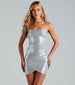 Channel your inner space babe in this metallic mini dress for a look that's out of the world! It features a sleeveless cowl neckline. spaghetti straps. a strappy open back made to turn heads. and a flattering bodycon silhouette and wrap mini-length hem. Style with chunky platform heels for the club!
