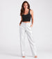 These fabulous faux leather cargo pants will give off major space glam vibes! They feature a high-rise waist. a front zipper and button closure. front and back pockets. a straight-leg silhouette. and are composed of a coated faux leather fabric with a metallic sheen. Style with a basic crop top and clear mules.