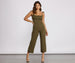 Keep it chic in fab jumpsuit for your next brunch date! The jumpsuit features spaghetti tie straps to create a custom fit. a square neckline with shirring at the bust and a flared culotte leg. Style jumpsuit with clear heels and statement earrings.