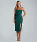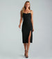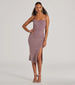 Spark everyone's attention when you arrive in this glitter midi dress to bring shimmer to dressy parties and semi-formal weddings! The dress features a sleeveless cowl neckline. spaghetti straps. a curve-hugging silhouette. and a sultry slit along the hem. Complete the look with fringe earrings and heels.