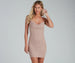 Ready to party? This glitter mini dress sure is! It features a sleeveless. cowl neckline. spaghetti straps. and a form-fitting silhouette on a short hem. Complete the look in earrings and lucite heels.