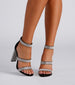Create a sparkling scene in heels that bring the glamour! The heels feature a zippered back. a rhinestone embellished ankle strap. a rhinestone strap. an open almond toe with a rhinestone strap over the toe. and a rhinestone block heel. The heels are composed of a faux patent leather material with a chrome finish. Complete look with a satin formal dress and evening bag.