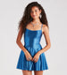 Be the sparkling sensation at the party in this glitter satin dress perfect for the dance floor! It features a sleeveless square neckline. a padded bust. adjustable spaghetti straps that crisscross in the back. a flattering skater silhouette. a short-length hem. and a sassy lace-up back design with tie closure. Complete the look in platform block heels.
