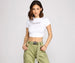 Pamper yourself with a crop top that says it all! The crop top features a crew neckline. short sleeves. a script that reads: "Spoiled". and a cropped hem. The top is composed of a semi-sheer cotton knit fabric that offers a relaxed fit with a moderate stretch. Complete look with cargo pants.Â