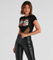 Spooky yet flirty. this graphic crop tee is a staple for the days leading up to Halloween! It features cap sleeves. a crew neck. a front skull. and rose graphic details with slashes along the cropped hem. Complete the look in leather skinny pants.