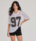 This trendy oversized jersey is perf for the sporty babes. Designed with an open jersey mesh fabric. the casual tee features a V-neckline. short sleeves. a mid-length hem with an oversized fit. and a contrasting "97" screen on the front. Style with boyfriend jeans and sneakers for weekend game days!