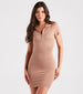 Get a sporty-chic style with this adorable knit mini dress. It features a collared V-neckline with a zip-front. short sleeves. and a mini-length. curve-hugging silhouette. The lined knit fabric offers plenty of stretch. Complete the look with trendy mules.
