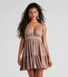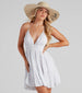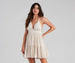 Feel the breeze this spring! This linen skater dress is perfect for your next daytime soiree featuring a sleeveless halter V-neckline. open-back design. dual tie-back closure. and a flowy. A-line skater silhouette. Composed of linen fabric with an inner knit lining with minimal stretch. Style with strappy heels.