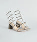Spring into these block heels designed with spiral rhinestone straps that effortlessly wrap around your ankle for a statement look! They feature a sleek square toe. block heel. and satin material. Style with a sphere clutch.