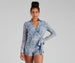 Bring on the warmer temps in this stylish chiffon romper perf for brunches! It features long sleeves. a collared v-neck. a surplice bodice with tie closure. and a snake pattern. Composed of non-stretch chiffon fabric with an inner knit lining. Style with lace-up heels.