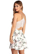 This ivory skater dress is a perfect. soft vision of spring. It features a square neckline. adjustable spaghetti straps that lead to a sheer lace back and zipper closure. a high waist seam. and a fitted bodice that leads to a short flowy skirt. Dress is composed of a stretchy scuba fabric with an all over ivory and blush floral print.