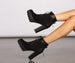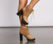 Stack on the style with booties that create chic head-turning moments! The booties feature a faux suede body with a lined pattern. a lace up front with small metal grommets. a lug sole. and a stacked block heel. Complete your chic layered look with a striped sweater and dark wash denim jeans.Â