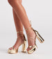 You'll be the star of the show in these chunky metallic heels made to be seen at themed parties or formal affairs! They feature a square toe. thin toe straps. a chunky platform sole. a closed ankle with lace-up straps. and a block heel. Complete the look in a short formal dress!