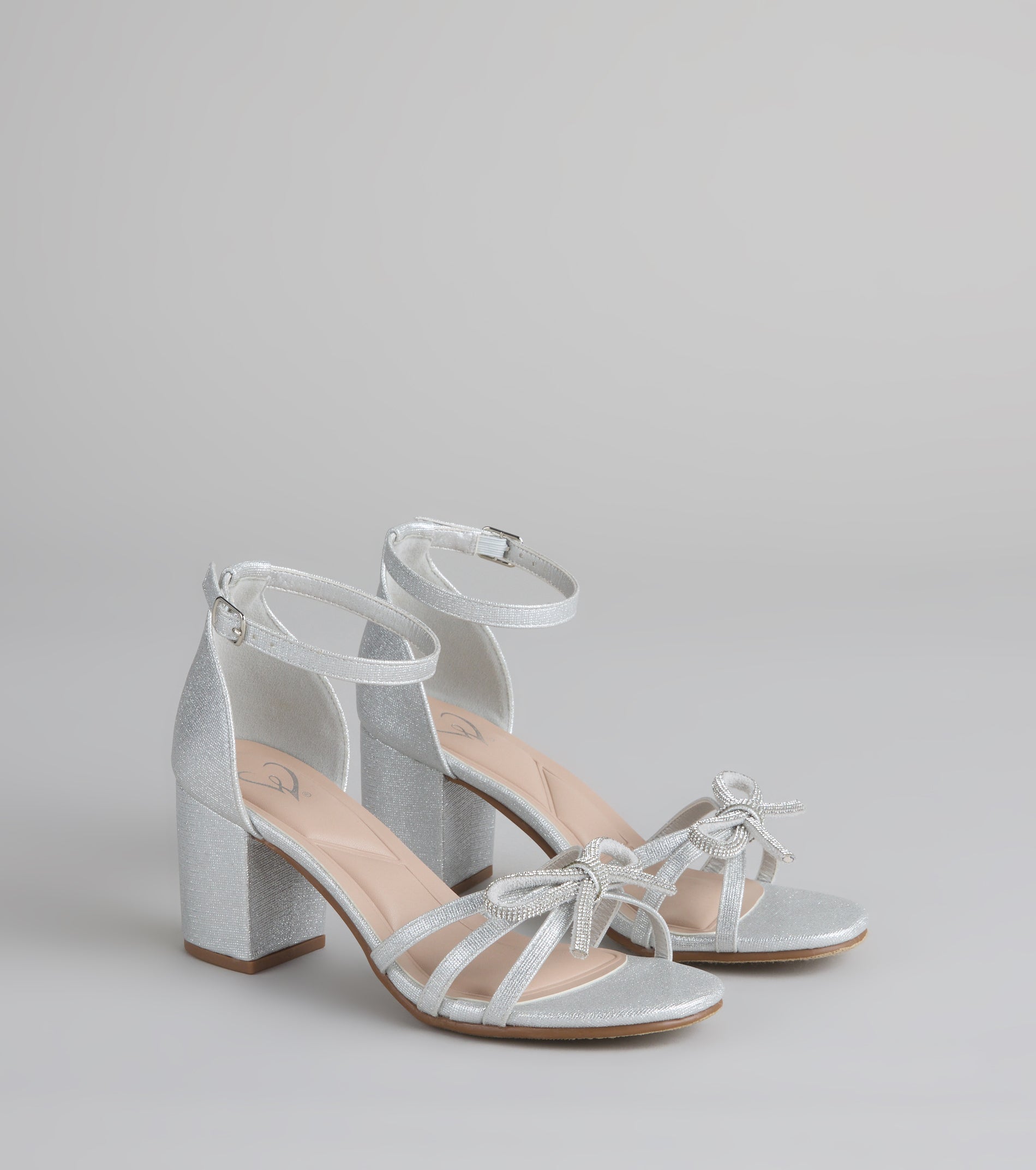Designed to dazzle. destined to be noticed. These glitter block heels bring high-shine elegance with rhinestone bows that add the perfect luxe touch to any night-out moment.