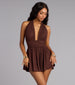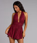 Meet the romper that turns every entrance into a moment. This glitter-kissed halter romper features a deep plunge neckline. an open back that brings all the drama. and a twirl-worthy skirt that moves like a dream.