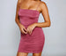 Start a spark with a mini dress that showcases your luxe style! The dress features a sleeveless square neckline. bungee spaghetti straps. a ruched body. and a mini-length silhouette. The dress is composed of a lined smooth knit fabric that offers a form hugging fit with a moderate stretch. Complete look with lucite heels and gold jewelry.