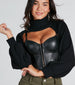 Stay cozy even on your nights out this season with this trendy sweater topper! It features a turtleneck with a fold-over design. long loose sleeves with tapered hems. an ultra-cropped hem. and is composed of a comfy ribbed sweater knit fabric. Layer over a sultry corset top with cargo pants for a casual-chic going-out look!