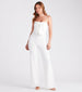 Steal the show when you step out in this crepe jumpsuit perfect for a rehearsal dinner or a dressy party! It features a strapless neckline with a statement bow and a flattering wide-leg silhouette. Complete the look with an envelope clutch and earrings.