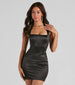Give off major chic babe energy in the Stella satin mini dress! She features a sleeveless square neckline with mini heat stone embellishments. halter straps. a trendy corset-designed bodice. and a short. curve-hugging. bodycon silhouette. The smooth satin-knit fabric offers a moderate stretch. Style this dress with strappy stilettos.