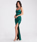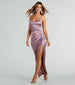 So sleek and stunning. the Stella satin formal dress will elevate your wedding guest. party. or dance look! She features a sleeveless cowl neckline. spaghetti straps that lead to a cross-back design. a high waist seam. ruching. a floor-length hem with a thigh-high front slit. and a slim-fit silhouette. The silky-satin knit fabric offers a moderate stretch. Style with a sticky bra and rhinestone earrings.