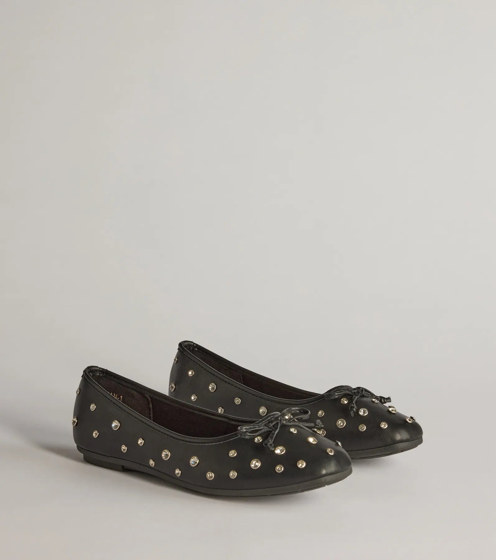 Step into these chic faux leather rhinestone stud ballet flats perfect for styling with your favorite skirts or dresses.