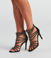 Step out in these sparkling rhinestone nubuck heels featuring an open almond toe. stiletto heel. closed ankle with zipper closure. and a strappy cutout design. Complete your dressy look in a cocktail midi dress.