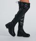 Stomp it up in these faux leather lug boots to elevate your everyday style! They feature a round toe. inner zipper closure. a sturdy lug sole. and a thigh-high shaft with an elastic insert and tie for easier on-and-off styling. Complete the look in a basic smooth knit dress and jacket!