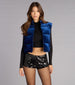 Your off-duty look. elevated. This velvet puffer vest brings cozy luxe energy with a plush texture and cropped fit that instantly upgrades any casual 'fit. Pair it with your favorite bottoms—it's giving soft glam meets street luxe.