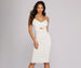 Stripe it right with this oh so chic midi dress! It features a sleeveless bodice. adjustable spaghetti straps. a keyhole cut out. a high waistband. a hidden back zipper closure. a back slit. and a mid-length. form hugging fit. The ivory dress is composed of a woven fabric with minimal stretch and showcases a gray striped print.