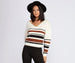 We are diving right into the fall season! This pull over sweater features a modest v neckline. long sleeves. and a lattice lace up back detail. Hem hits mid torso and pull over is composed f a knit material that shows a contrasting striped pattern. Throw on a hat and you are fall ready!